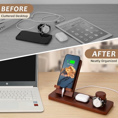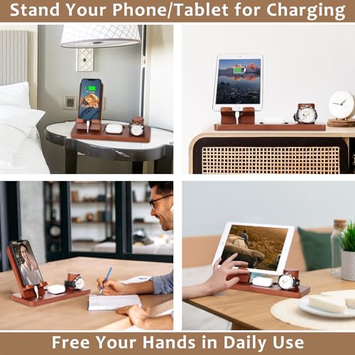 - Thoughtful Design: Unlike other charging stations that only support one phone charging, the Funistree phone docking station has larger place for multiple devices charging simultaneously, including phones, tablets, earbuds, power banks, and smartwatches. Our wood docking station can also be used as phone or tablet stand to free your hands when cooking, dining, and reading. Note: The watch charger hole is compatible with Apple Watch charger