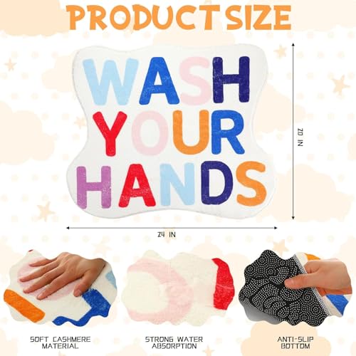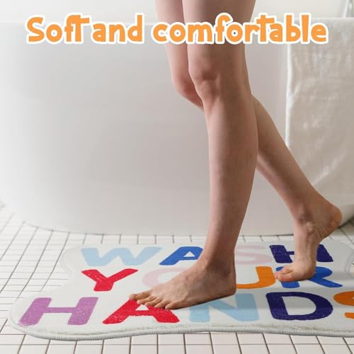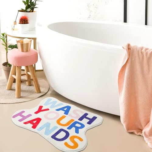 - Funny and Cute: available in a soothing white background with words of [ Wash Your Hands] in rainbow colors, this funny bath mat brings vibrant to your bathroom; Its irregular shape design combined with the funny quotes injects a sense of fun and positivity, enhancing your bathing experience, adding a humorous, stylish, and funny touch to your bathroom decor