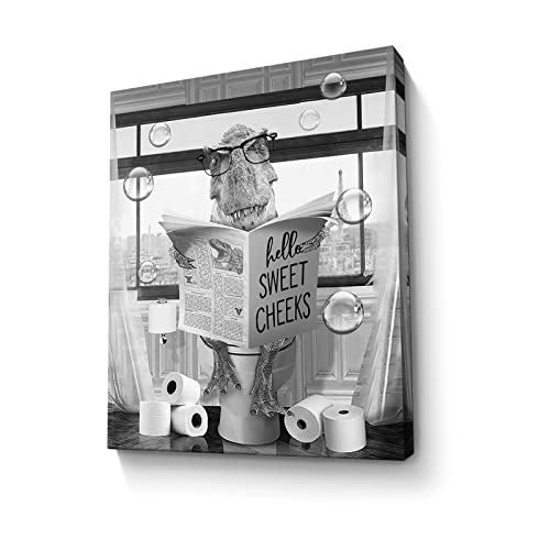 Parylore - Funny Dinosaur Wall Art Black and White Bathroom Print Farmhouse Bathroom Animals Wall Decor Dinosaur Sitting in Toilet Reading Newspaper Painting Framed Artwork for Toilet Bathroom 12x16 inch
