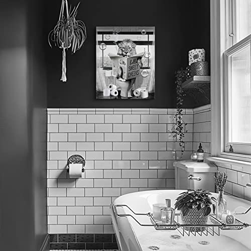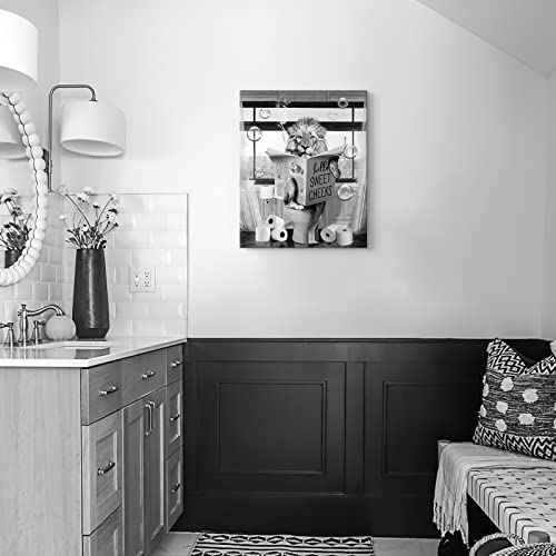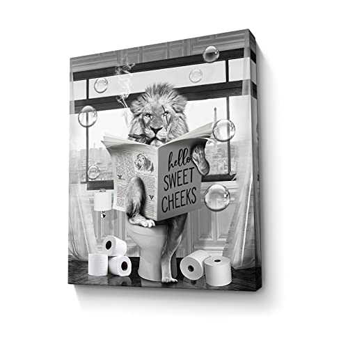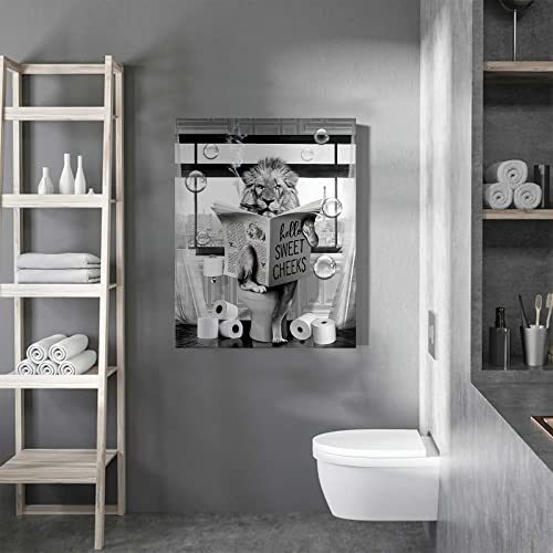 Parylore - لوحة فنية جدارية على شكل اسد مضحك باللونين الاسود والابيض مطبوع عليها حمام وحيوانات واسد جالس في المرحاض وقراءة الصحف مؤطرة للمرحاض والحمام 12 × 16 انش متعدد الألوان