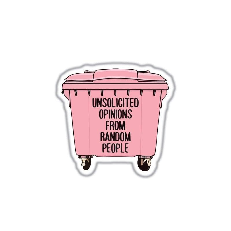 - DESIGN FEATURES: Unique pink dumpster-themed vinyl sticker with bold black text displaying a humorous message about unsolicited opinions