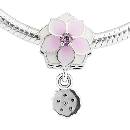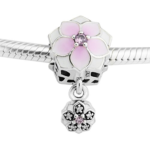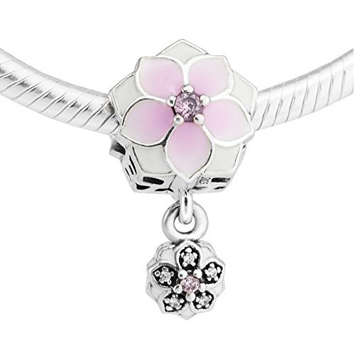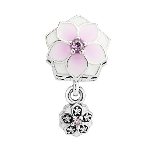FUNSHOPP - Spring Collection Pink Magnolia Bloom Flower Dangle Beads 925 Silver DIY Fits for Original Pandora Bracelets Charm Fashion Jewelry