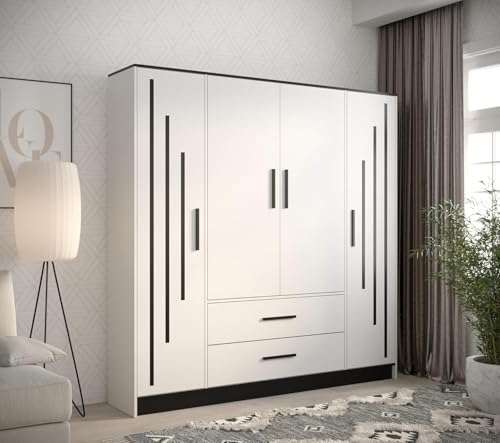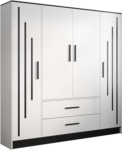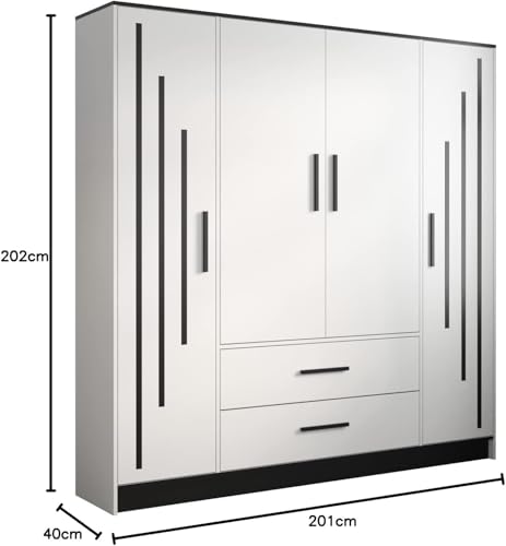 FurniFlex - 201 Hinged Door Wardrobe with 4 Doors/2 Drawers/2 Mirrors, M5 Matte White/Black