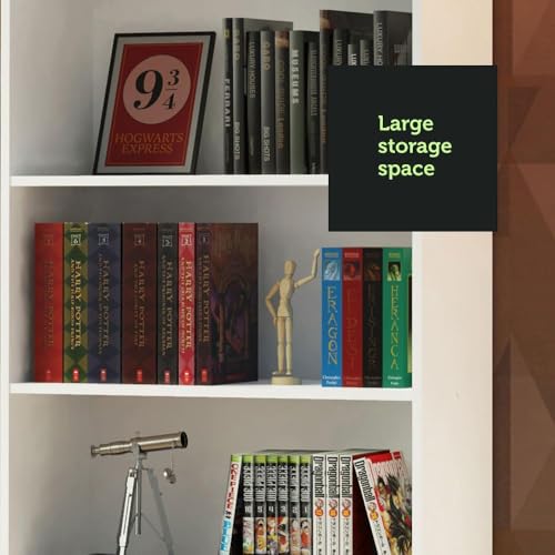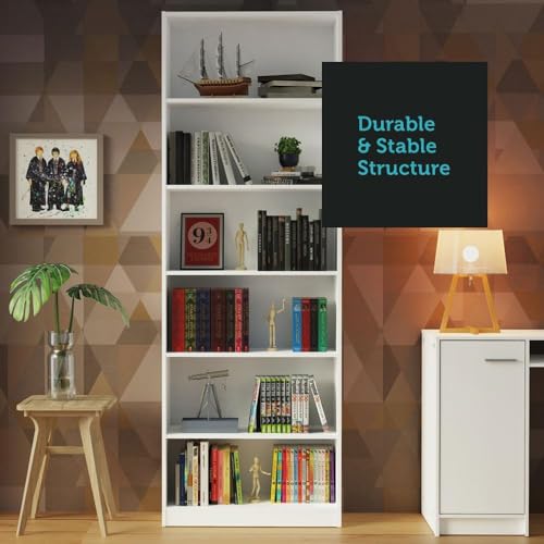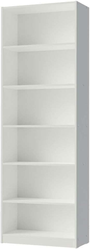 - Tall 6-shelf bookcase with a white finish, perfect for storing and displaying various items