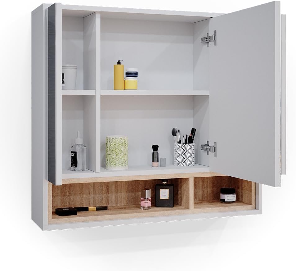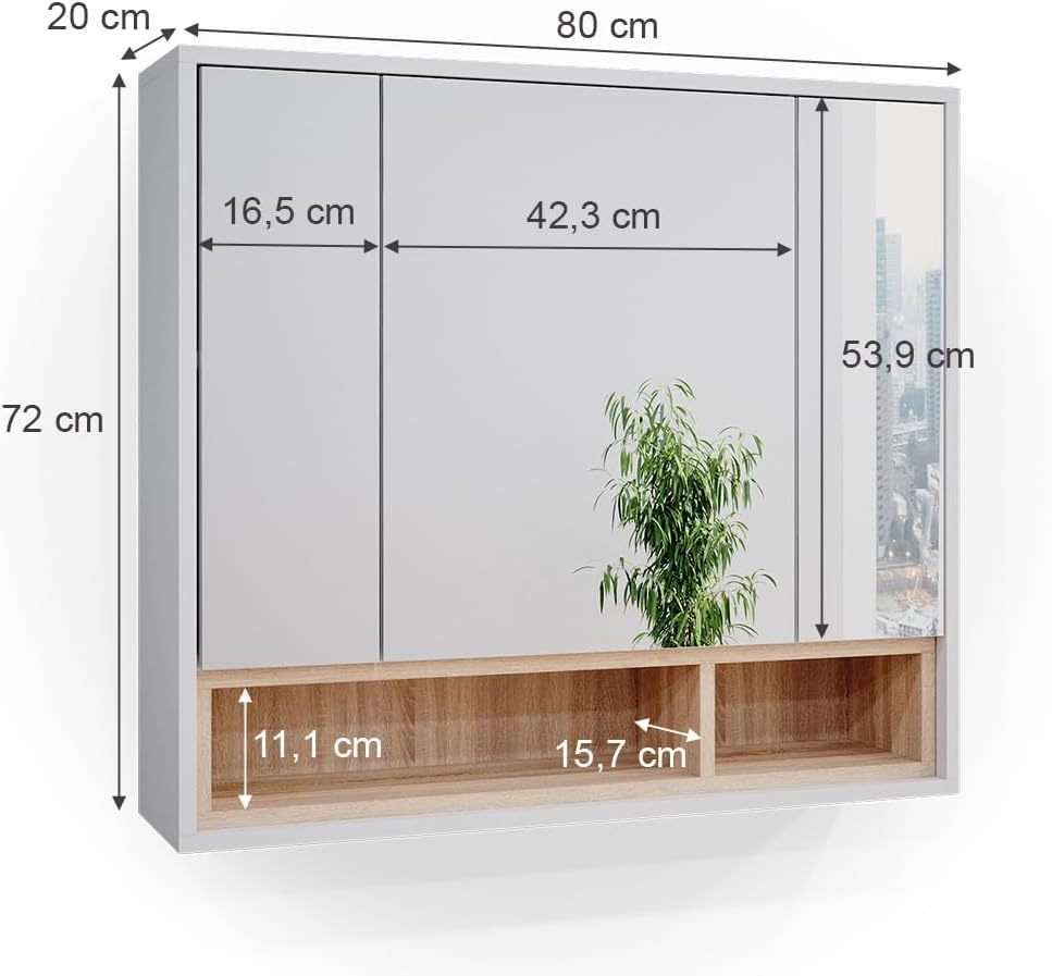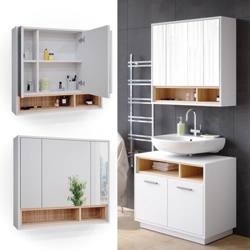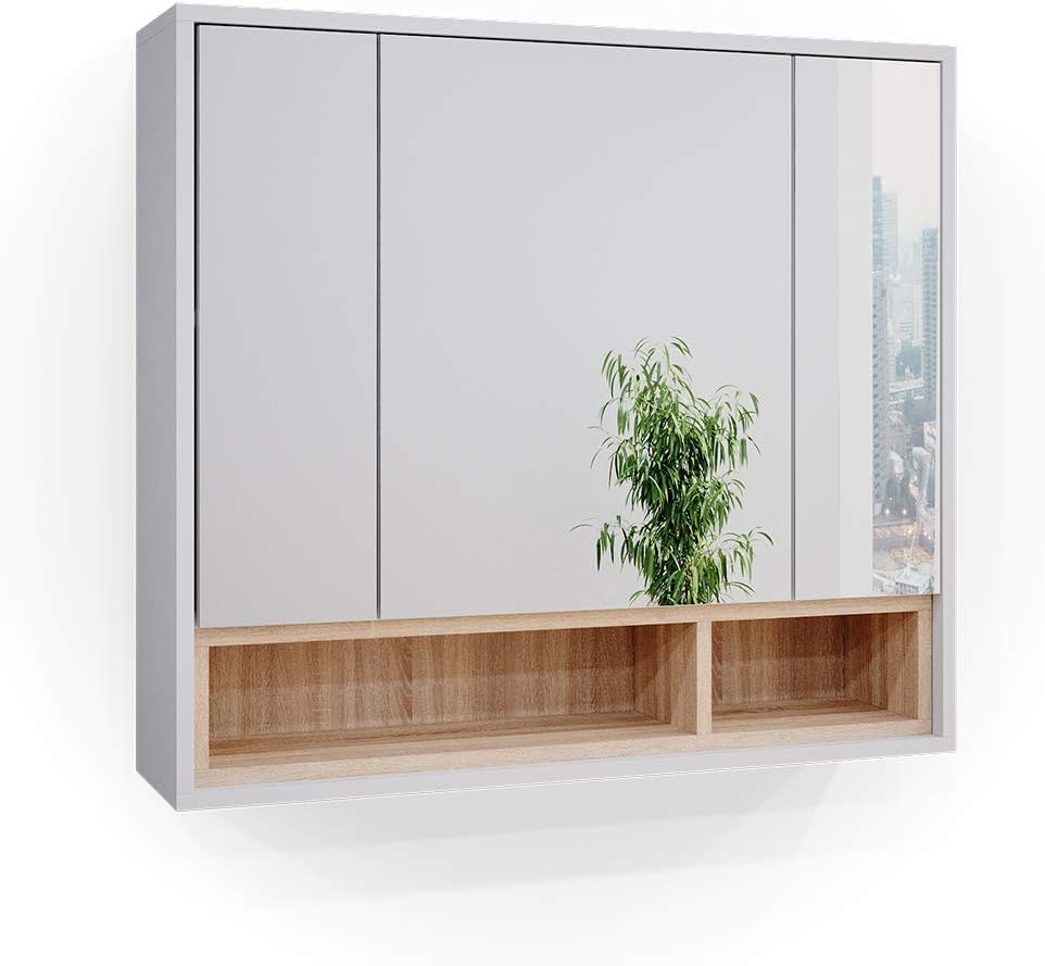 FurniFlex - Beatrice Bathroom Mirror Cabinet with 3 Door Shelf, 80 cm Size, White/Sonoma