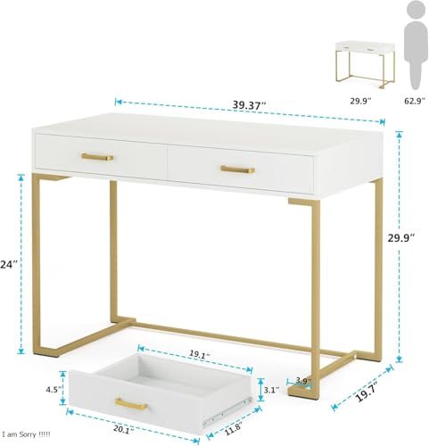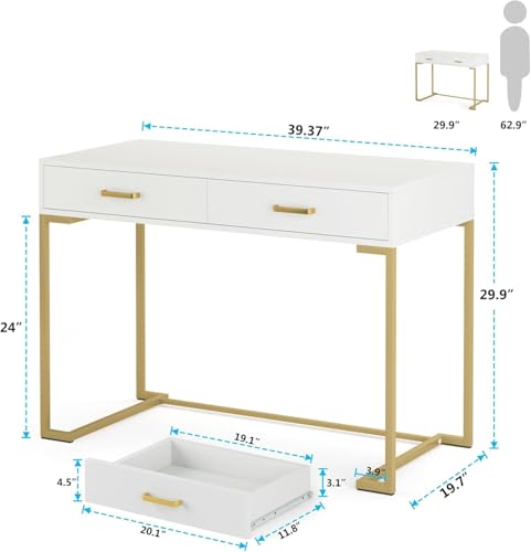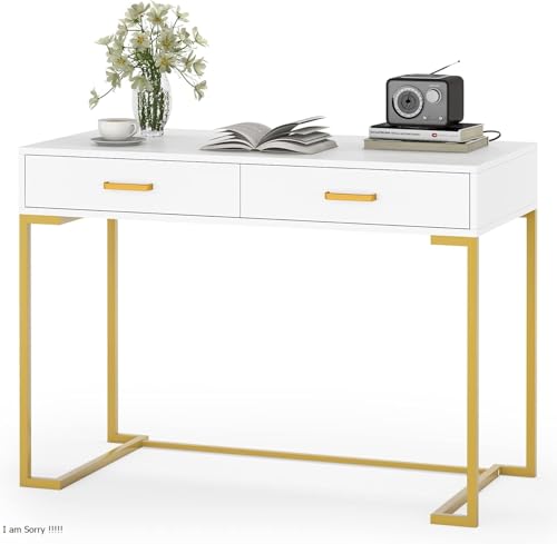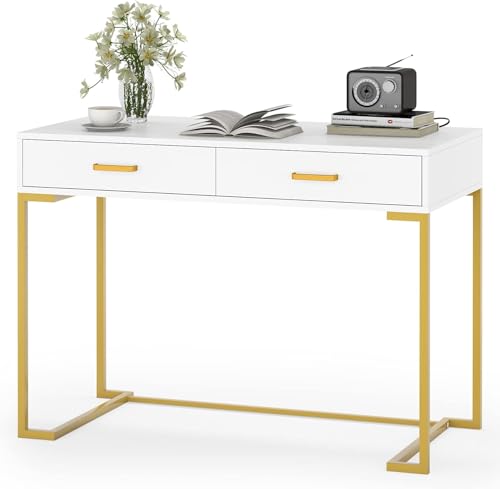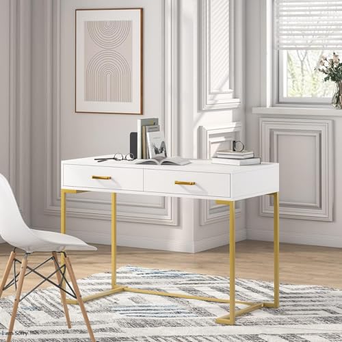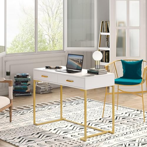 FurniFlex - Computer Desk with 2-Drawers, White/Gold