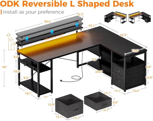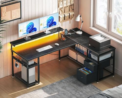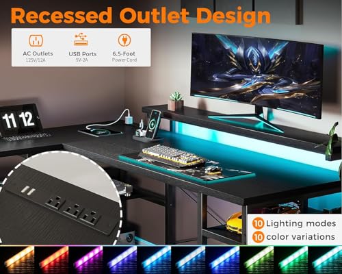 FurniFlex - مكتب ألعاب على شكل L مع برايز طاقة وشريط إضاءة ليد من فورني فليكس، 1.35 م، أسود