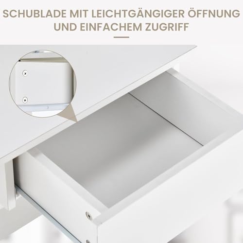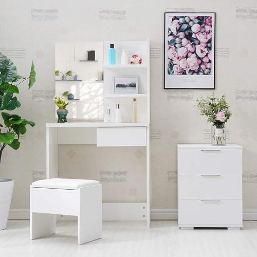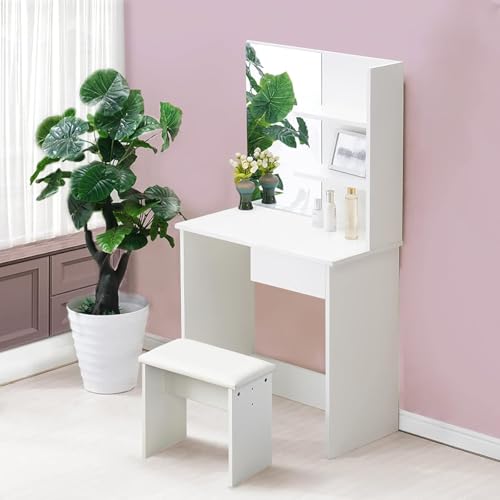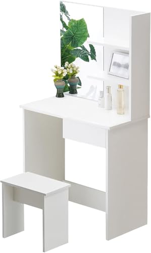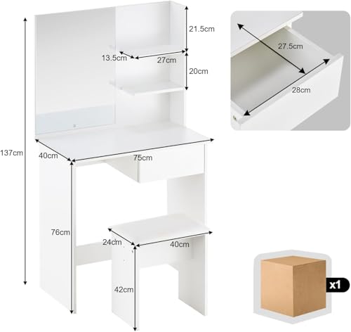 FurniFlex - Small Size Dressing Table with Mirror and Stool, 75 cm x 40 cm x 137 cm Size, White