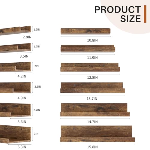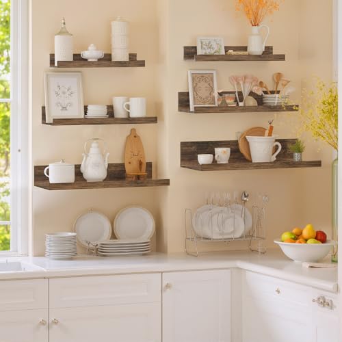 FurnitureR - FurnitureR Rustic Floating Wall Shelves Set of 6 – Wood Display & Storage Shelves for Bathroom, Bedroom, Kitchen, or Office – Wall Mounted, MultiSize Design, Brown