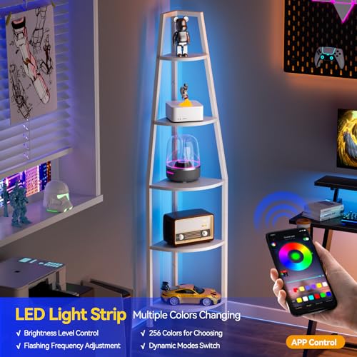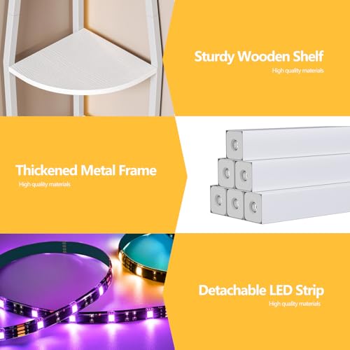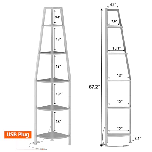 Furnulem - Furnulem 5 Tier Corner Shelf with LED Light, 67.2” Tall Standing Shelf for Wall Corner, Narrow Bookshelf Ladder Shelf for Bedroom, Living Room, Plant, Wood Storage Rack, Metal Frame (White)