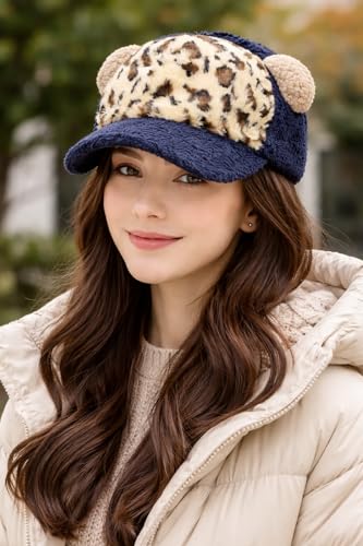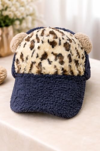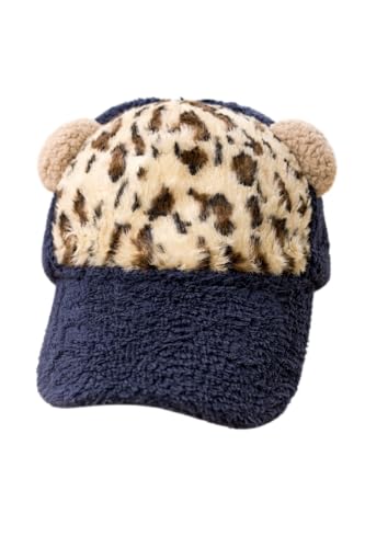 Generic - Fuzzy Baseball Cap with Leopard Print and Bear Ears, Navy Blue, Plush Winter Hat