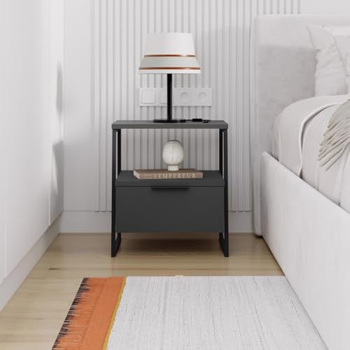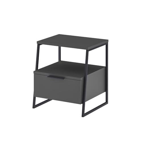 FWStyle - FWStyle 1 Drawer Anthracite Bedside Table – Modern Nightstand with Black Metal Frame – Spacious Drawer & Open Shelf – 50cm High