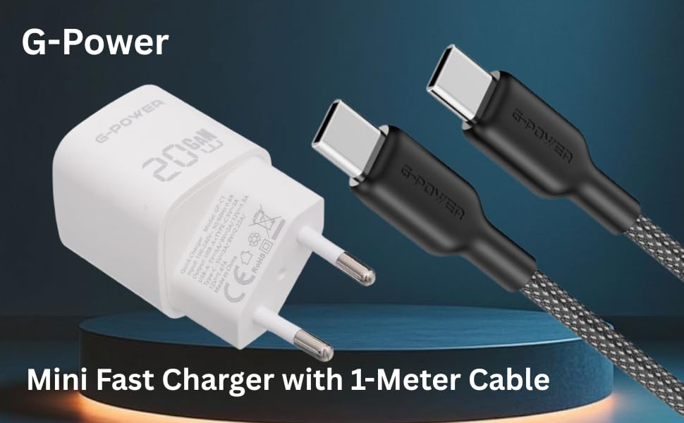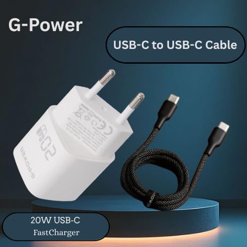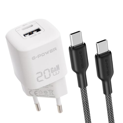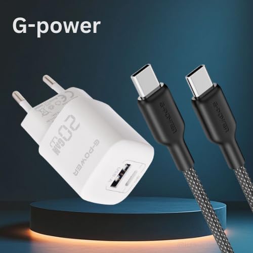 G-POWER - شاحن سريع مزدوج USB 20 واط + كيبل USB-C الى USB-C 65 واط من جي باور - لسلسلة ايفون 17/16/15 وسامسونج جالكسي وبيكسل وايباد - ابيض واسود