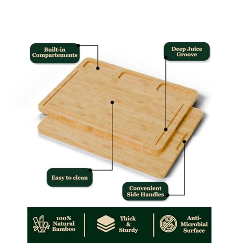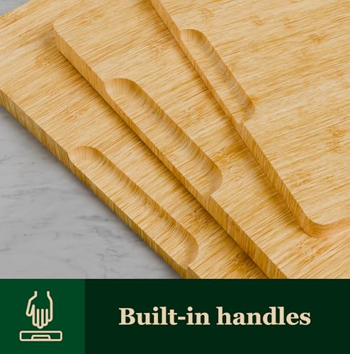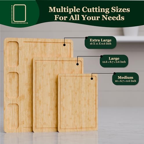 - DEEP JUICE GROOVES: Each board features deep grooves to catch juices from fruits and meats, keeping your countertops clean and reducing mess during meal prep.