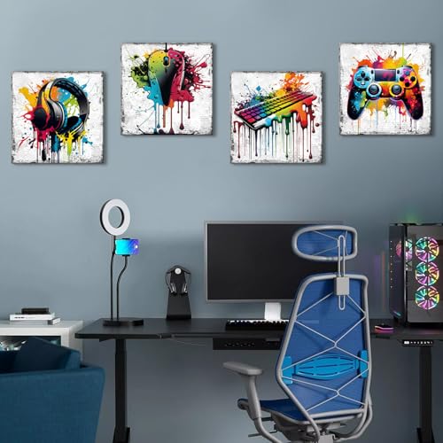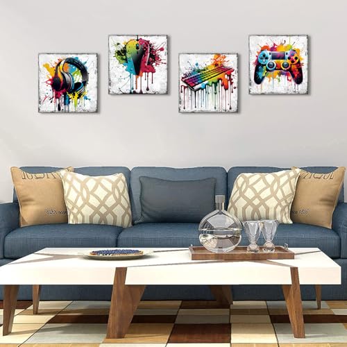 YOOOAHU - Game Room Decor Wall Art Graffiti Gamepad Headphones Canvas Prints Pictures Gamer Room Decor for Boys Street Pop Art Gaming Bedroom Playroom Cool Video Painting Teen Cave Modern Artwork 12x12" 4 Piece