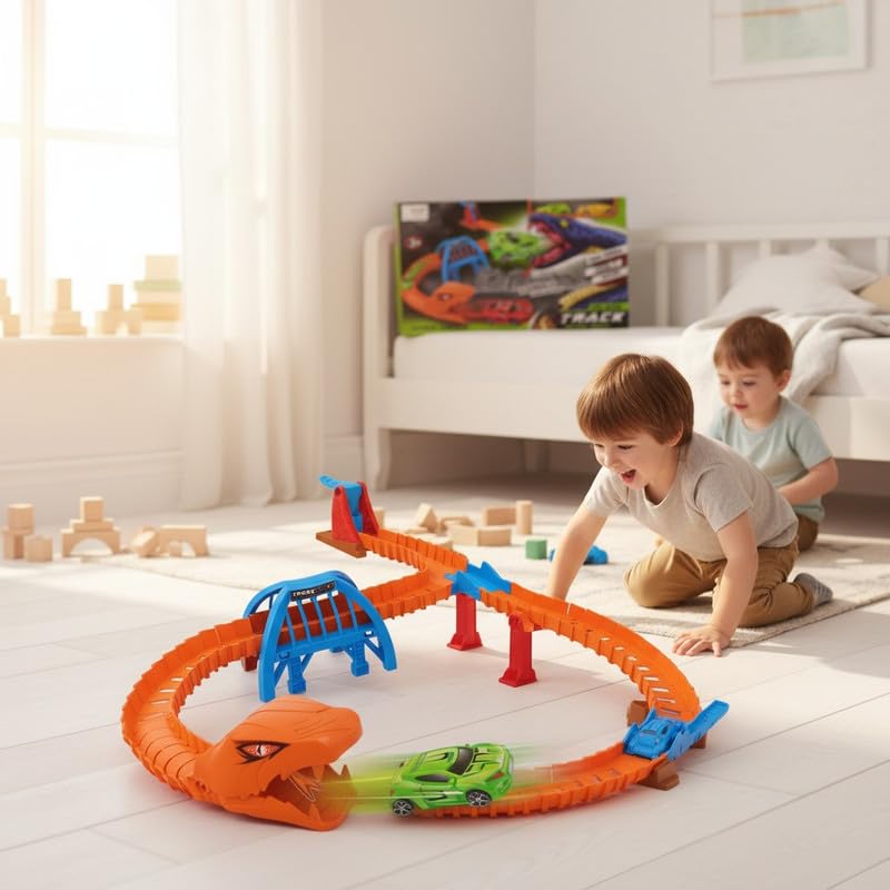 - 2. Unique snake-shaped track design with a closed loop and bridge for interactive fun.