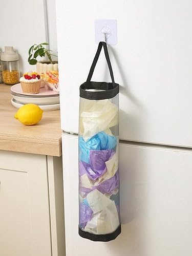 - VERSATILE STORAGE: Wall-mounted plastic bag dispenser with drawstring and zipper closure, perfect for organizing shopping bags in kitchen, bathroom, laundry room, or car