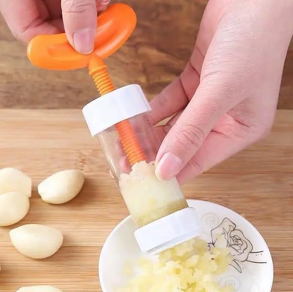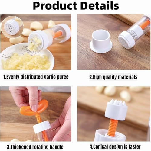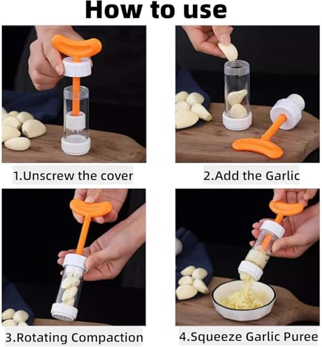 - EASY TO USE: The garlic masher includes placing garlic in a clear bottle, cover the spinner and roll, spin the screw easily, push and press to quickly press the garlic outside the evenly distributed garlic outlet holes