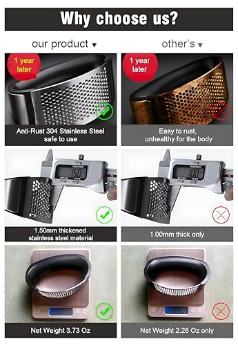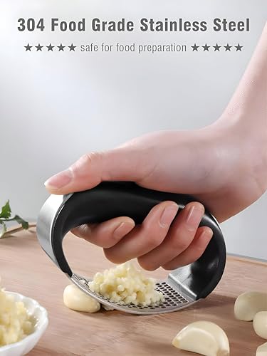 - This Garlic Press is made of high-quality stainless steel, ensuring durability, rust and corrosion resistance. This material not only enhances its longevity, but also offers a sleek, contemporary look that complements any kitchen decor.