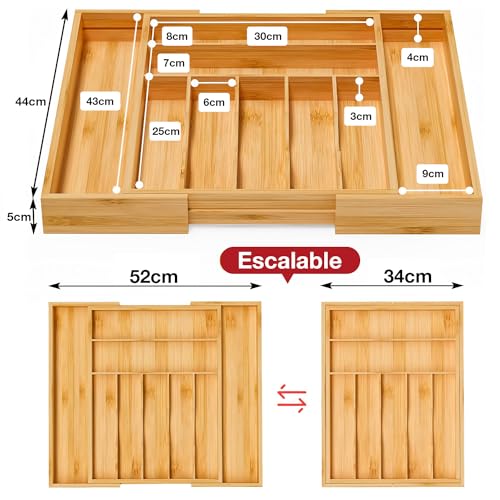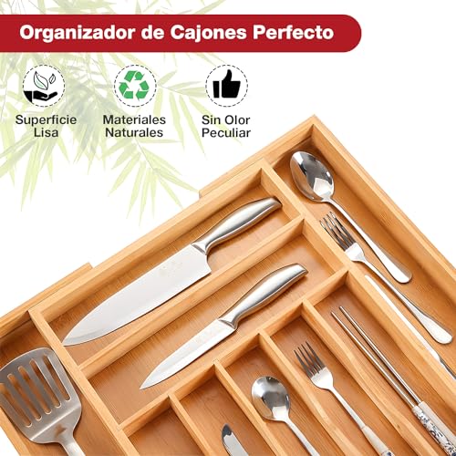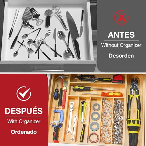 Garselay - صينية ادوات مائدة من الخيزران قابلة للتوسيع مكونة 9 اقسام جارسيلاي منظم مطبخ قابل للتعديل 100% صديق للبيئة ادراج خشبية متعددة الاغراض للتخزين والفرز