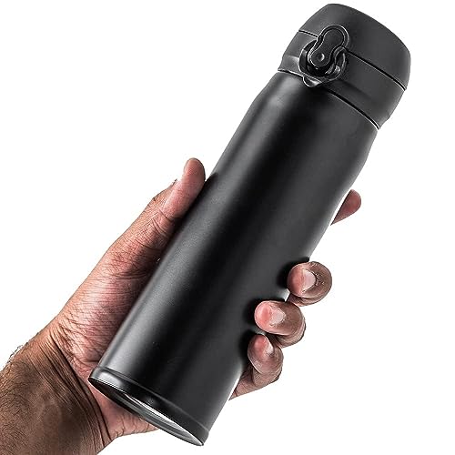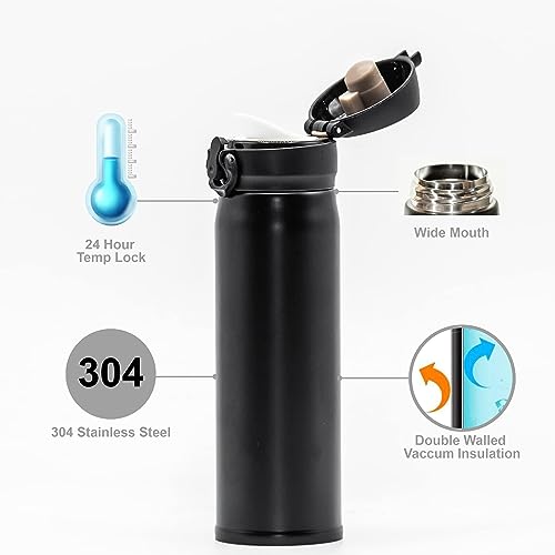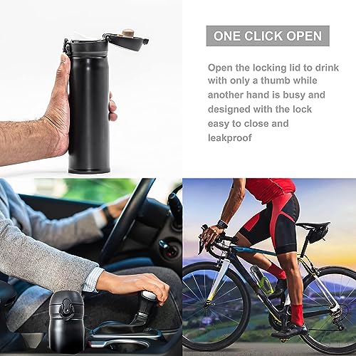 GearTek - One-Click Open Double Wall Insulated Flask 12oz Thermos for Hot and Cold Drinks, Travel Coffee Mug, Stainless Steel Sports Water Bottle Leakproof for Kids Adults (Black)
