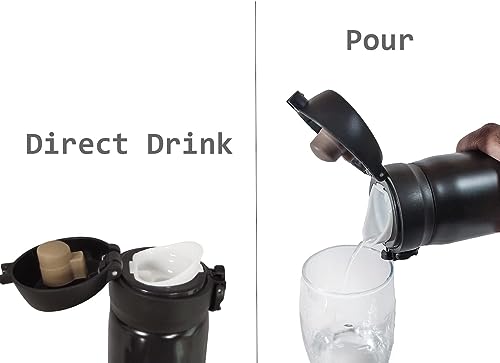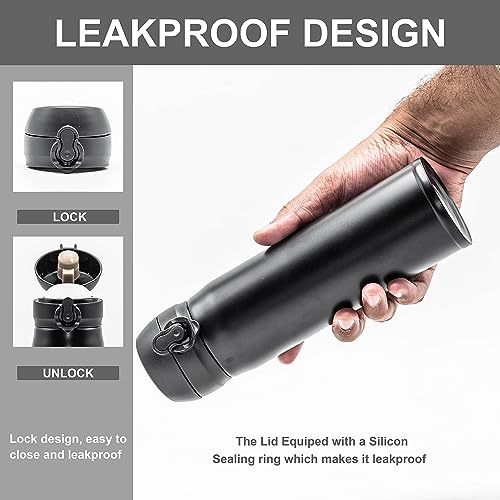 - ✔ LEAKPROOF AND SWEAT FREE : Double lid locks of bottle and silicone rubbers ensure no leak even if the water bottle is tipped over or shaken, no matter the temperature of the liquid in this bottle, it will never sweat and leave no condensation or be hot to the touchchool water bottle or hiking and bike thermal mugs. Premium quality material ensures durability while keeping the inside fluid fresh and dustproof. This reusable water mug is easy to clean and nice looking.