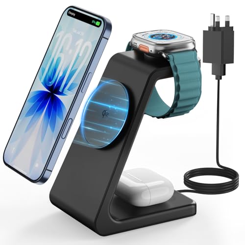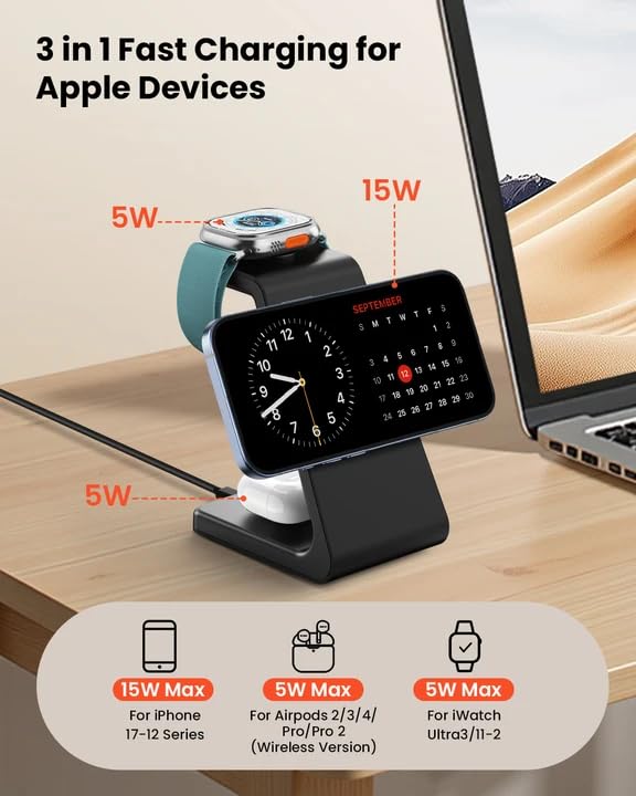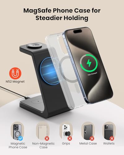 - Compatible devices: The 3 in 1 wireless MagSafe charging stand can compatible with iPhone16/15/14/13/12 Series, Apple Watch Ultra/10/9/SE/8/7/6/5/4/3/2, Airpods 2/3/4/Pro/Pro 2. For the best experience, use the original MagSafe case or charge your devices without any case. NOTE: Compatible with cases up to 3mm.