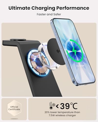 - 15W Fast Charging with Qi2 & MagSafe Certification: Charge twice as fast as standard wireless chargers with 15W high power—certified by Qi2 and compatible with MagSafe for trusted, top-tier performance. Its advanced chip technology ensures steady power flow at lower temperatures, safeguarding devices from overheating and boosting battery longevity.
