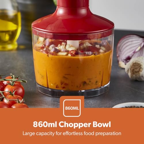- 2. 860ML CHOPPER BOWL & WHISK ATTACHMENTS - A spacious and transparent jar will allow you to prepare a full portion and control the degree of chopping. Whisk attachment included.