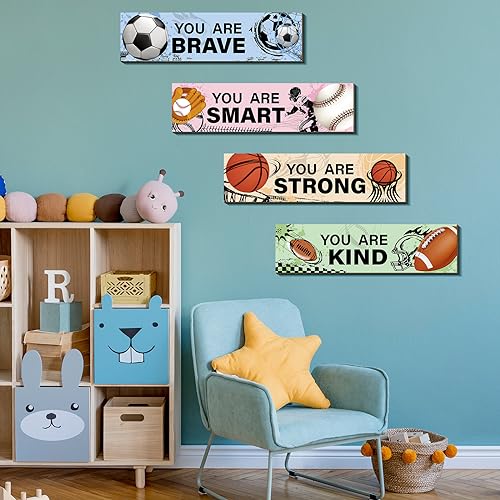 Geetery - ديكور حائط خشبي بطابع رياضي للأولاد، لافتة خشبية لكرة القدم 30 × 7.9 سم باقتباس ملهم، هدف كرة سلة معلق على الحائط، ملصقات رياضية لغرفة النوم وغرفة اللعب والحضانة، 4 قطع من الستيكرات