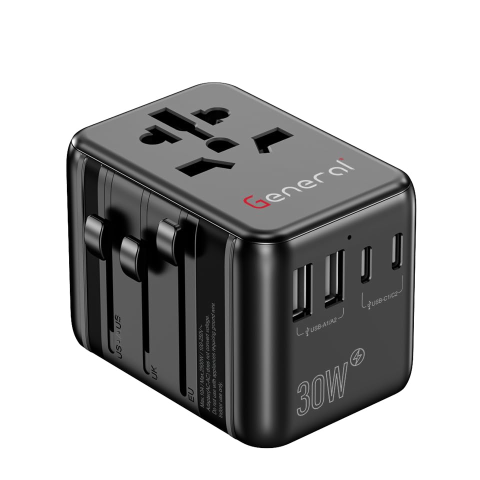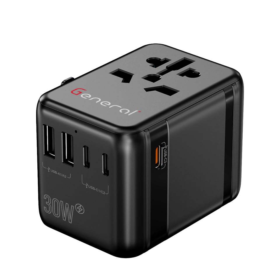 General - شاحن سفر - شاحن دولي متعدد الاستخدامات مع منافذ USB-A ونوع C، شحن سريع للموبايل والتابلت واللاب توب- فيشة تيار متردد متوافقة مع الفيش البريطانية/الأوروبية/الأمريكية/الأسترالية (30 وات)