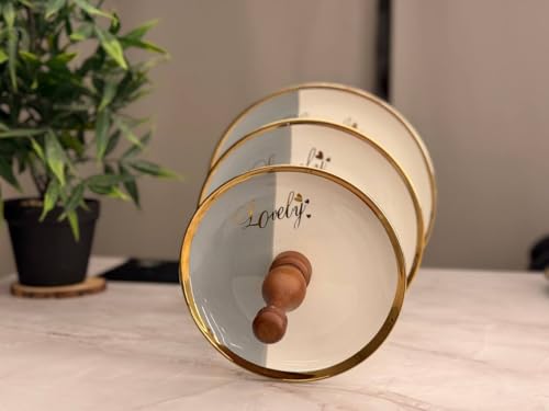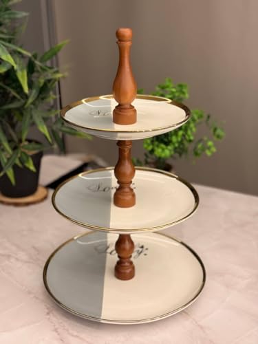 Generic - Generic 3-Tier Round Porcelain Dessert Stand with Gold Trim and Beech Wood Handle .soh
