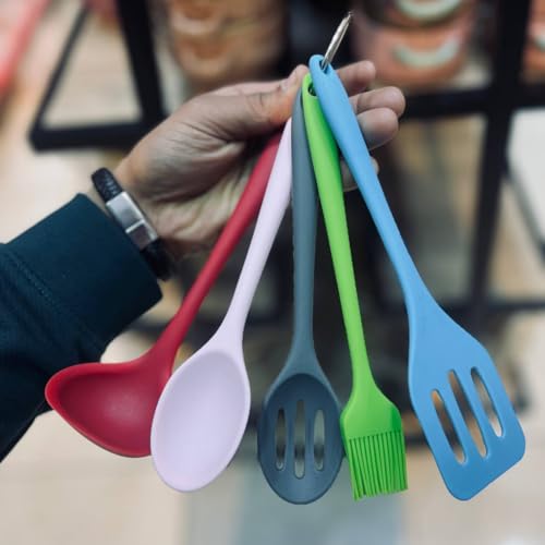- مجموعة كاملة: تتضمن مجموعة أدوات المطبخ المكونة من 5 قطع مغرفة وملعقتين (واحدة مثقوبة)، وفرشاة زيت، وحامل مثقوب بألوان نابضة بالحياة