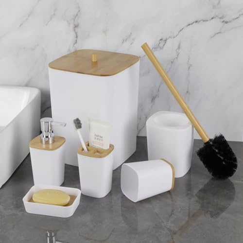 - Cohesive Design: This 6-piece bathroom accessory set boasts a sleek and modern aesthetic with a white matte finish accented by natural wood-tone lids and handles.