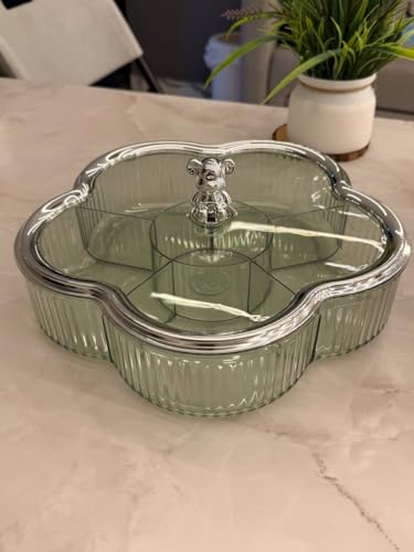 - ELEGANT DESIGN: Decorative snack serving tray features a charming flower-shaped design with green-tinted acrylic construction and silver-tone trim, topped with an adorable bear figurine lid accent