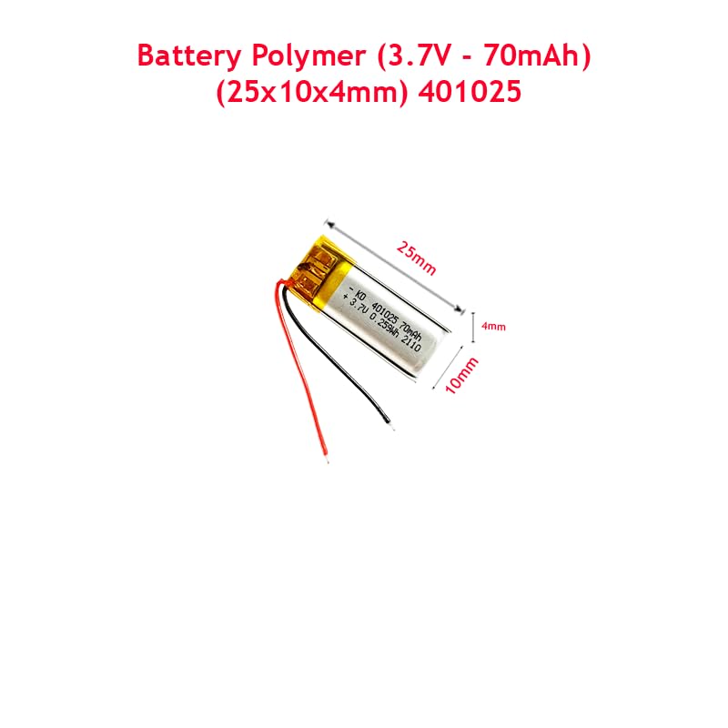 - Generic Battery Polymer (3.7V – 70mAh) Single Cell (25x10x4mm)