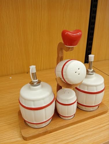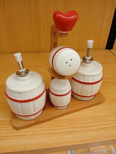 - مجموعة كاملة: طقم توابل سيراميك أنيق مكون من 4 قطع يتضمن 2 موزع زيت مع مضخة علوية و2 ملاحة ملح / توابل، بالإضافة إلى حامل عرض خشبي.
