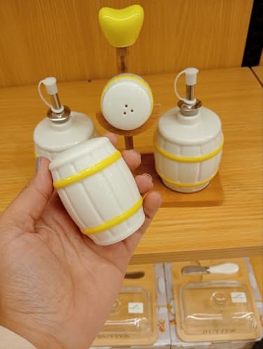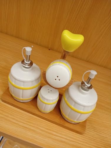 Generic - طقم توابل للمطبخ من السيراميك، مكون من ملاحة ملح وموزع زيت مع حامل حشبي، لون أبيض وأصفر، 4 قطع