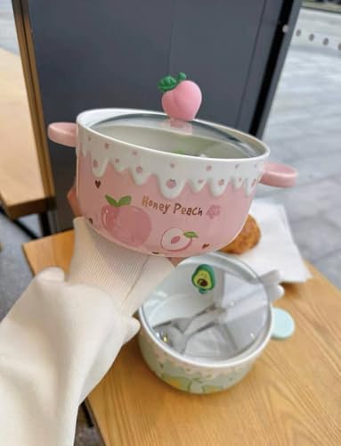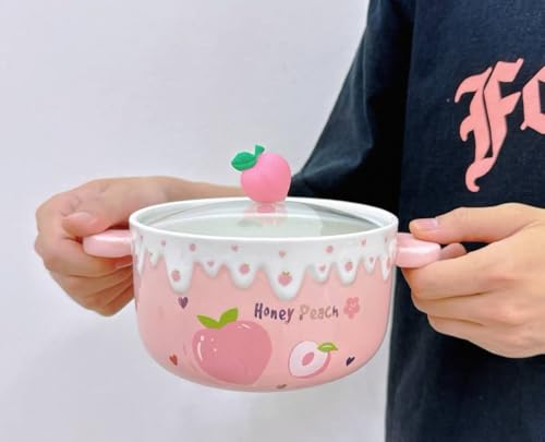 Generic - Generic Ceramic Noodle Bowl with Lid, Pink Cute Fruit Design, Double Handle Soup Cup with Decorative Peach Topper, .rom