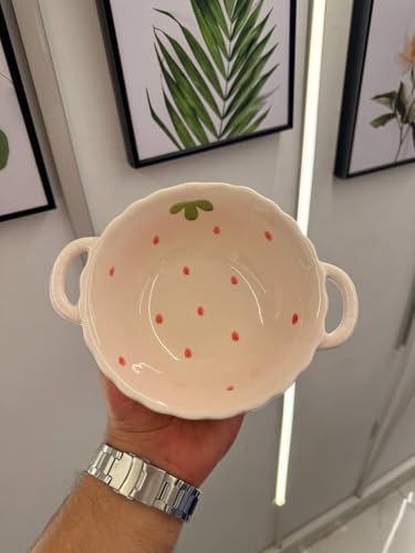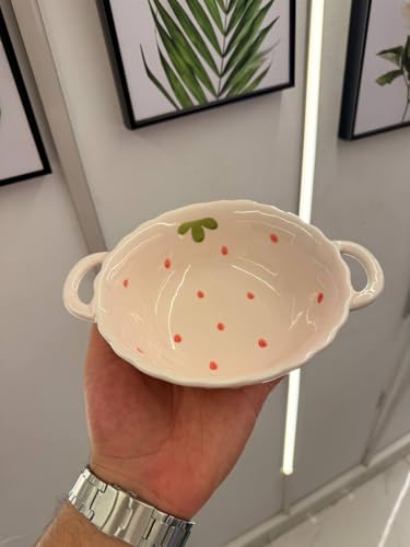 - التصميم: بولة سيراميك أنيقة بطابع الفراولة مع مقابض مزدوجة وحواف صدفية، تتميز بنقاط حمراء رقيقة وتفاصيل أوراق خضراء.