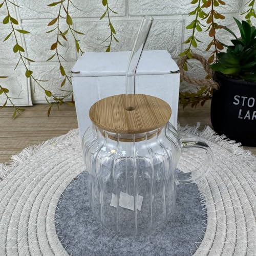 Generic - جيني كوب زجاجي شفاف بغطاء من الخيزران وماصة زجاجية، تصميم مضلع بمقبض، ادوات شرب من مادة ثقيلة
