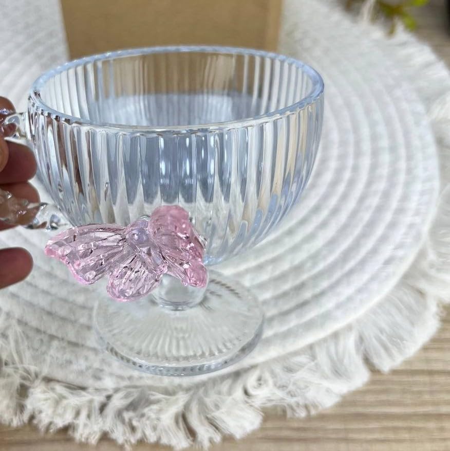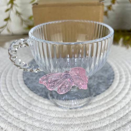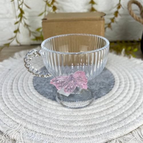 Generic - Generic Clear Glass Teacup with Pink Crystal Butterfly, Vertical Stripe Pattern, Elegant Decorative Handle .bar