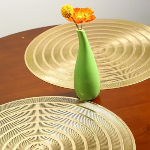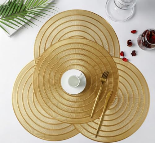 - تصميم أنيق: تتميز المفارش المستديرة الذهبية بنمط دائري متطور يضيف لمسة فاخرة إلى أي طاولة طعام