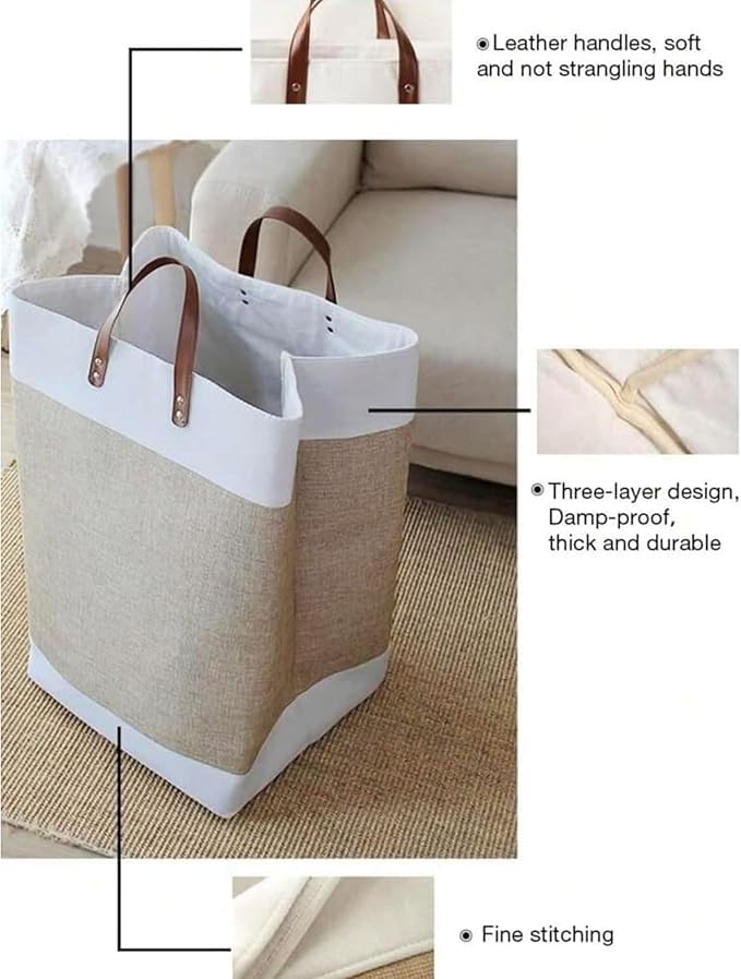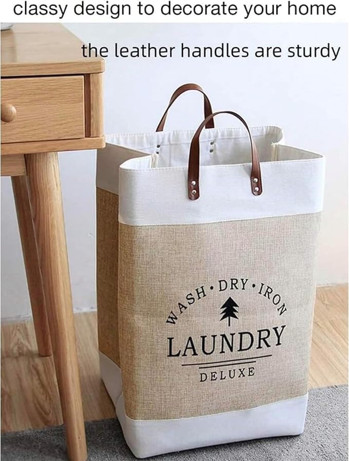 Generic - جيني سلة غسيل قابلة للطي بمقابض جلدية، بني وابيض، 52 × 37 × 50 سم، تصميم الكي الجاف.