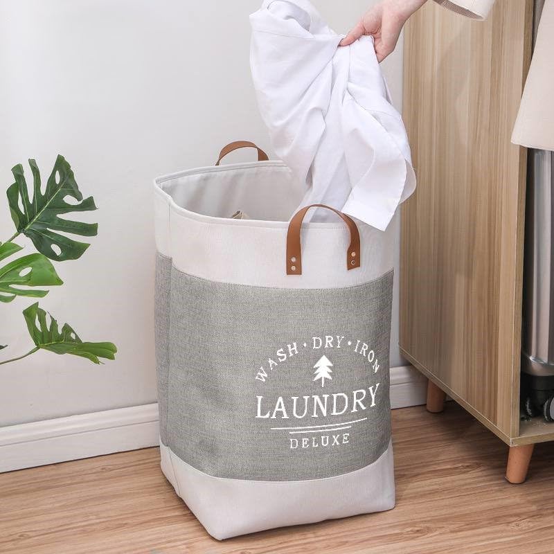 Generic - جيني سلة غسيل قابلة للطي بمقابض جلدية، رمادي وابيض، 52 × 37 × 50 سم، تصميم الكي الجاف.