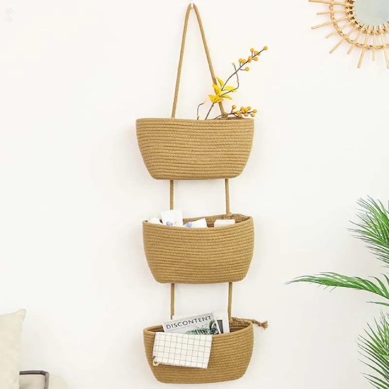 Generic - جيني سلة تخزين معلقة مزخرفة من 3 طبقات، منظم حبال من الكتان الطبيعي، حاوية مثبتة على الحائط للحمام والمطبخ وغرفة النوم وغرفة المعيشة. A2