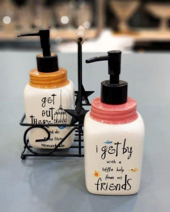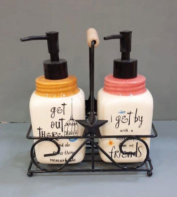 - DESIGN FEATURES: Set includes 2 ceramic soap dispensers with charming printed quotes and a stylish black metal stand for elegant bathroom organisation