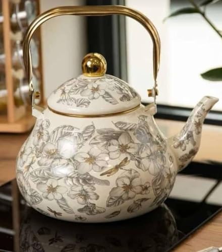 Generic - جيني ابريق شاي مزين بالزهور بمقبض ذهبي، 2.5 لتر، ابيض ورمادي. #
