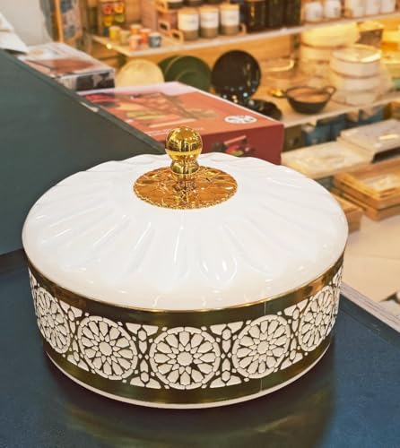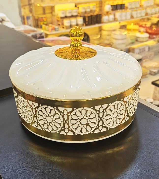 - تصميم أنيق: تتميز بنمط أرابيسك متطور باللون الذهبي والأبيض مع مقبض ذهبي على الغطاء لسهولة الرفع
