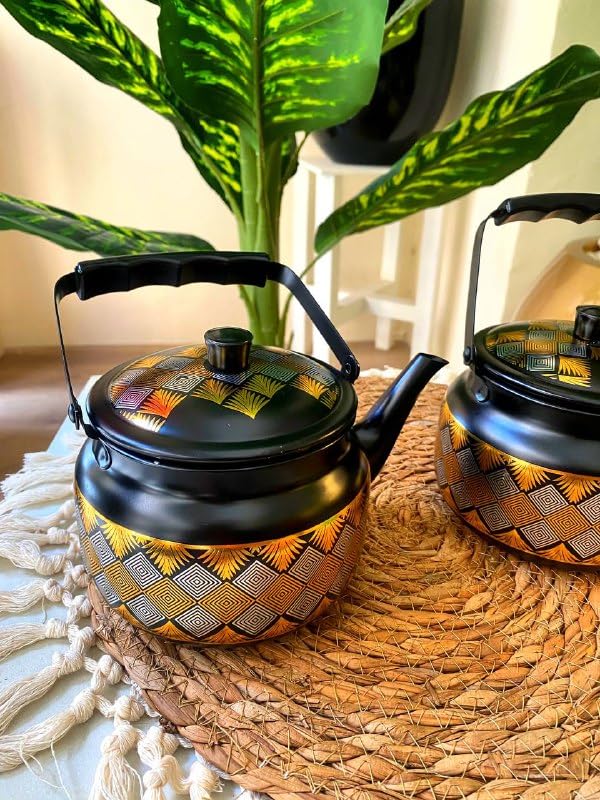 - ELEGANT DESIGN: Black kettle adorned with intricate gold-patterned detailing featuring geometric diamond motifs and decorative accents